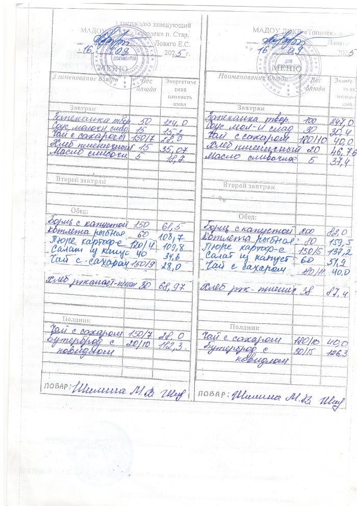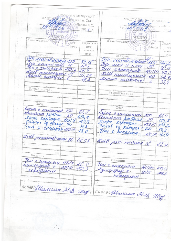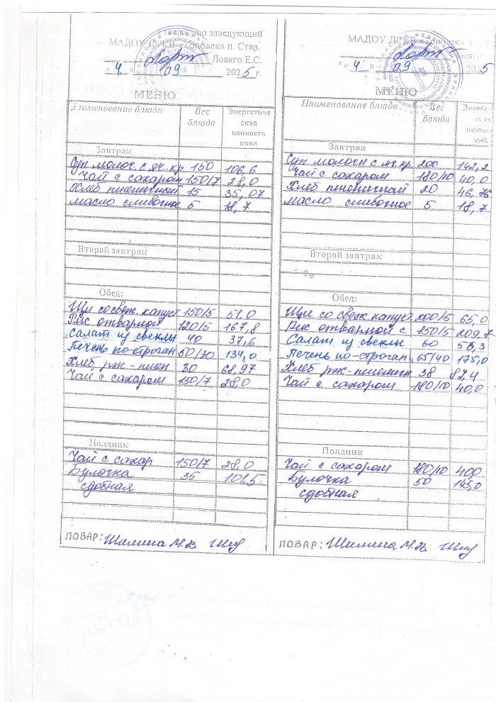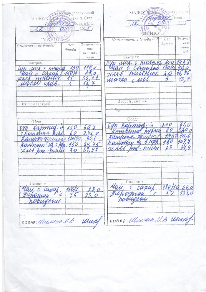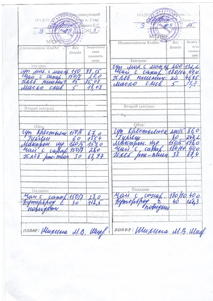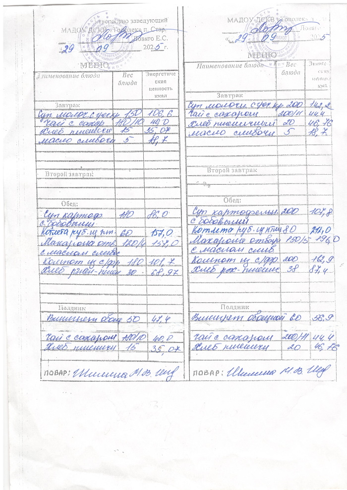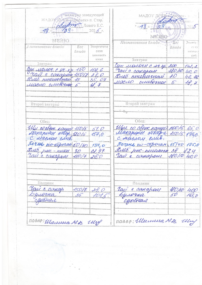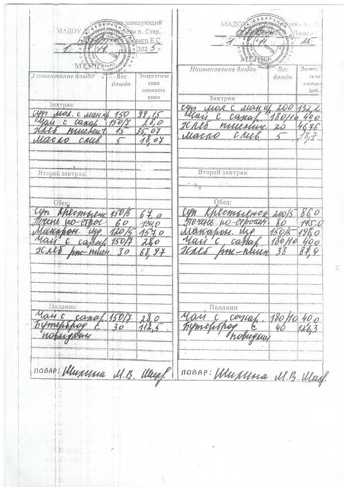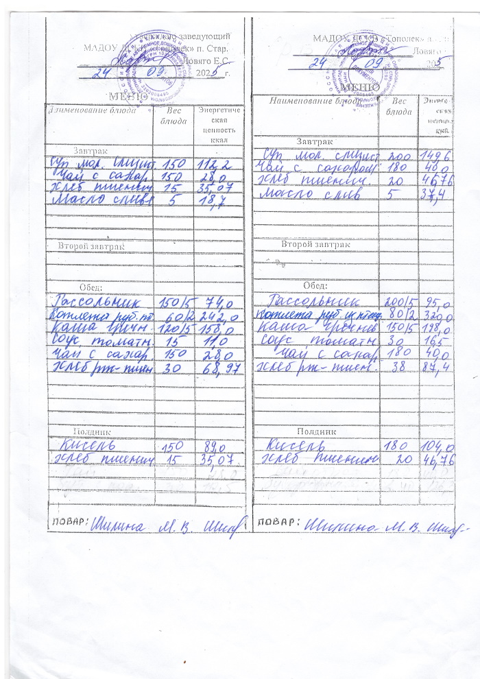 В детском саду питание организовано в групповых комнатах. Весь цикл приготовления блюд происходит на пищеблоке, который состоит из двух цехов, кладовой для хранения продуктов. Пищеблок на 100% укомплектован кадрами. Помещение пищеблока размещается на первом этаже, имеет отдельный выход.