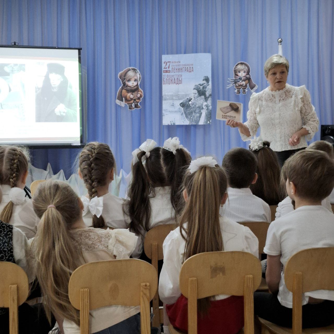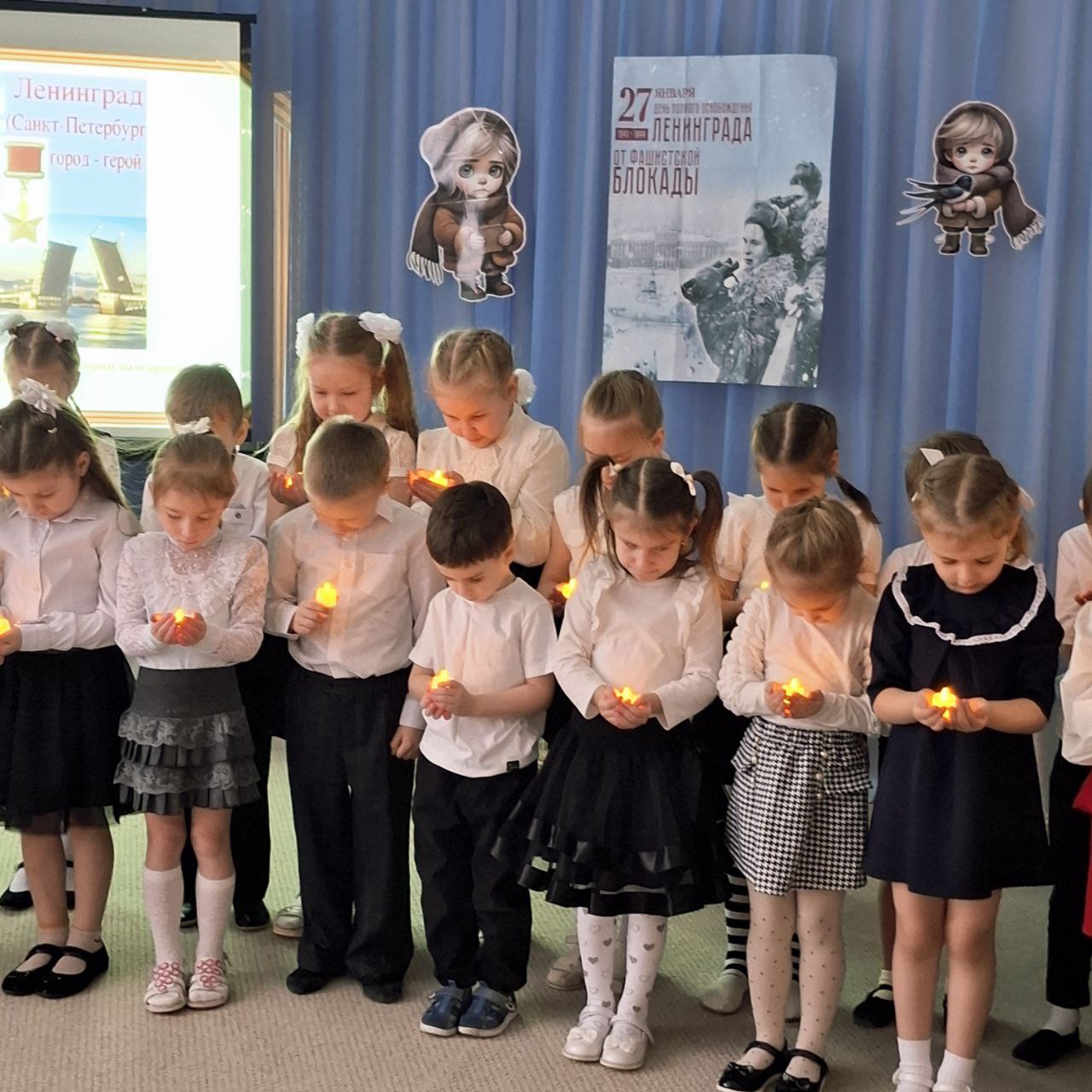 Рябята старшей и подготовительной группы внимательно слушали о детях блокадного города, Тане Савичевой, «Дороге жизни» и кусочке ленинградского хлеба. Воспитатели познакомили детей